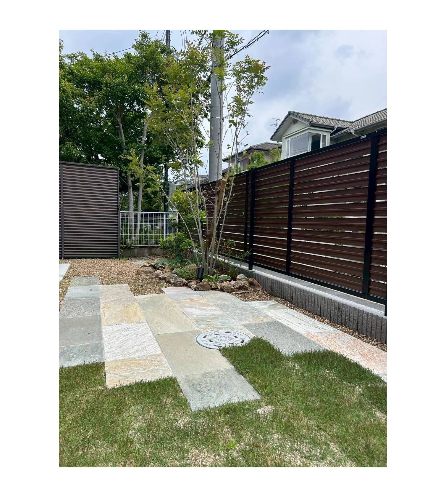 #タイル門柱 #乱形石 #天然芝 #アプローチ #ウッドデッキ #カーポート #オープン外構 #植栽