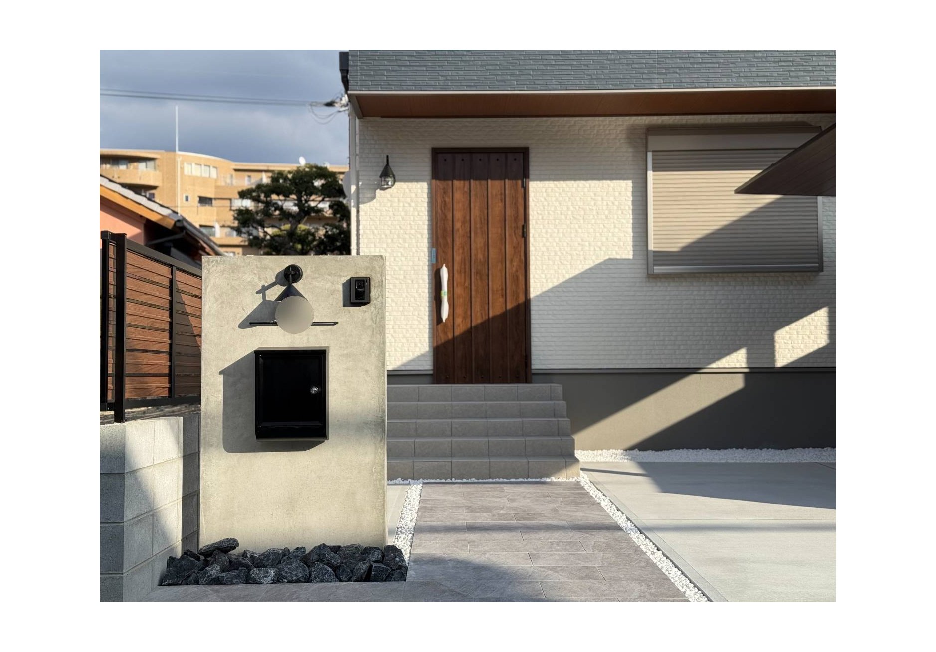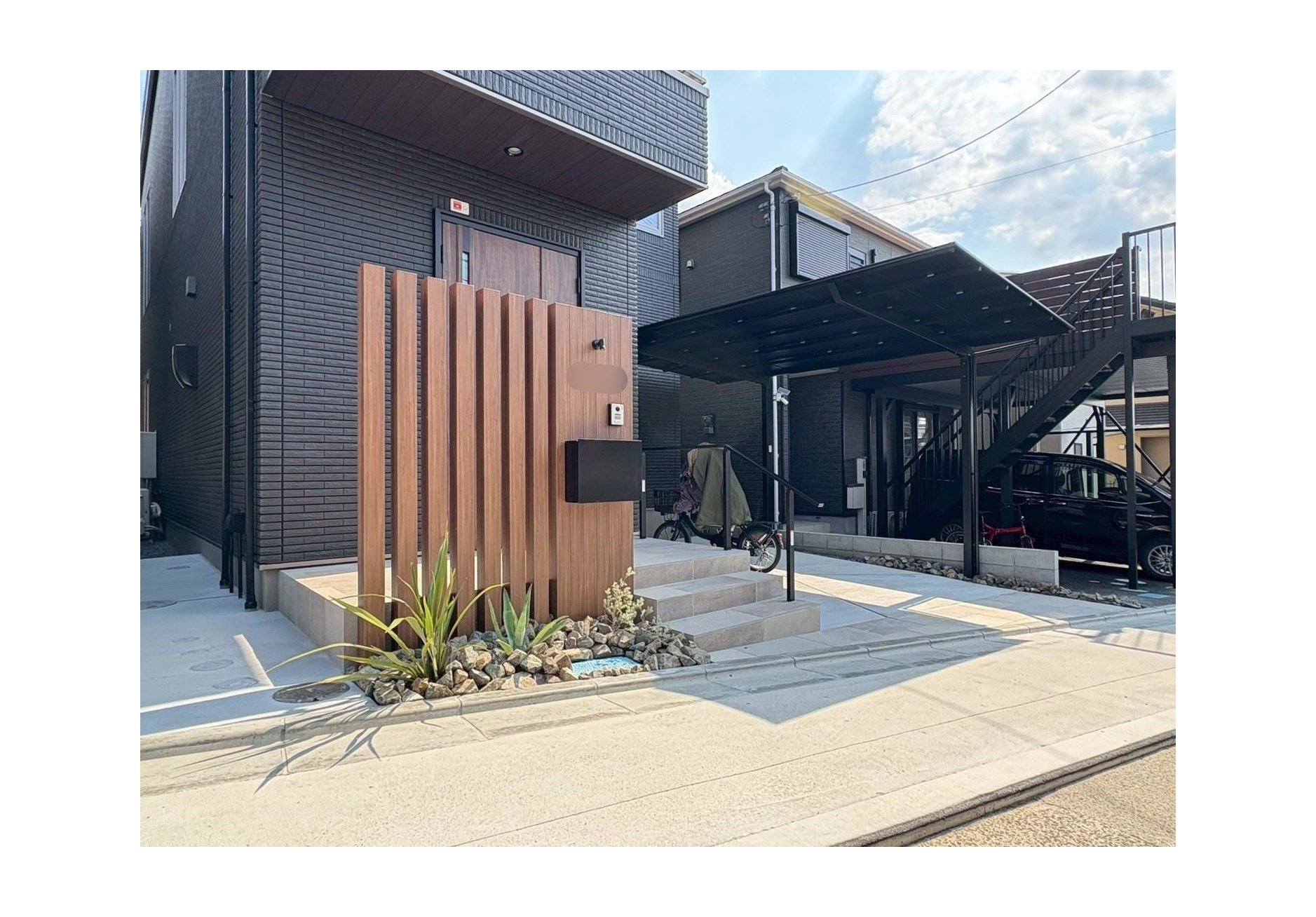 #アプローチ #カーポート #タイル門柱 #ゴロタ石 #手摺 #オープン外構 #ガレージ