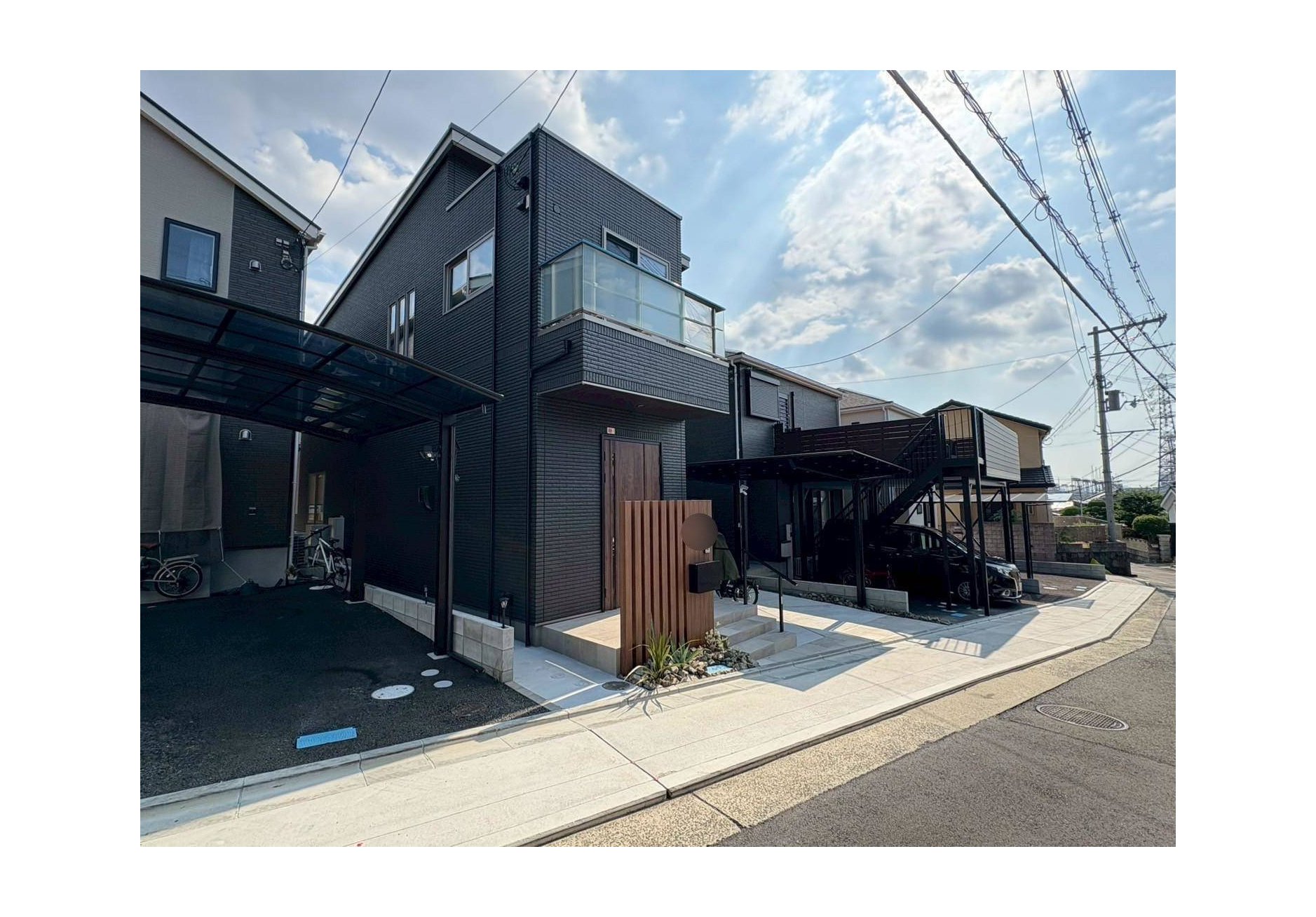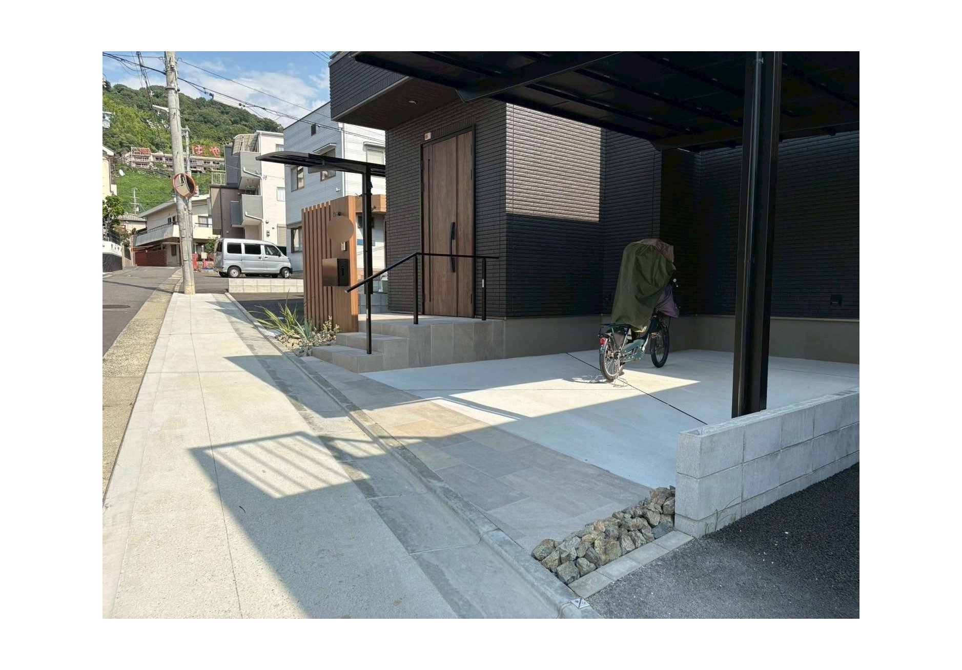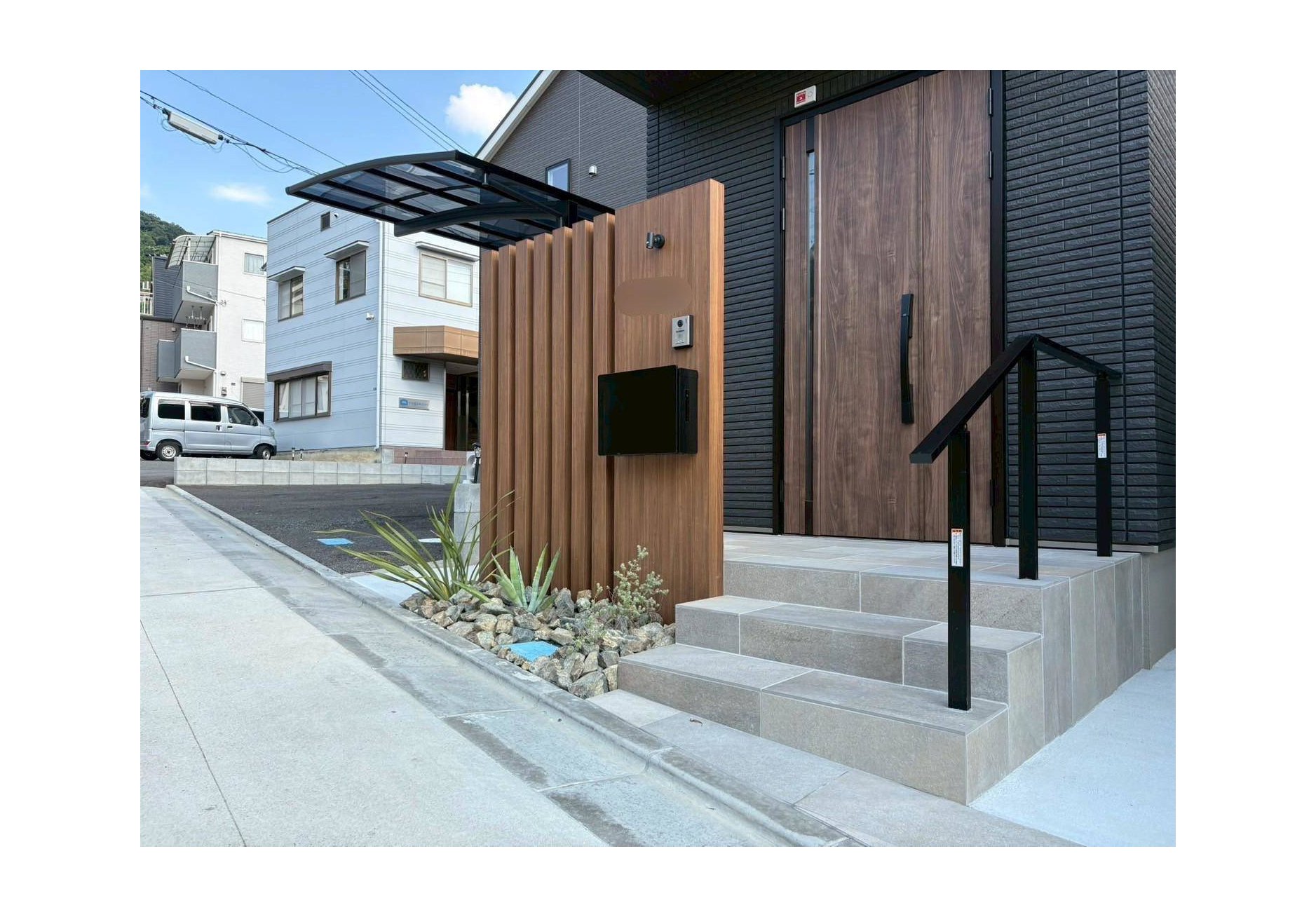 木目調の角柱がさりげなく玄関周りを隠してくれる統一感のあるオシャレガーデン。ガレージ入口には、玄関ポーチと同じタイルを並べることで、ポーチから駐車スペースまでつながりを持たせたデザインに。また、角柱下にゴロタ石や下草を配置することで温みのあるナチュラルモダンスタイルへ~。