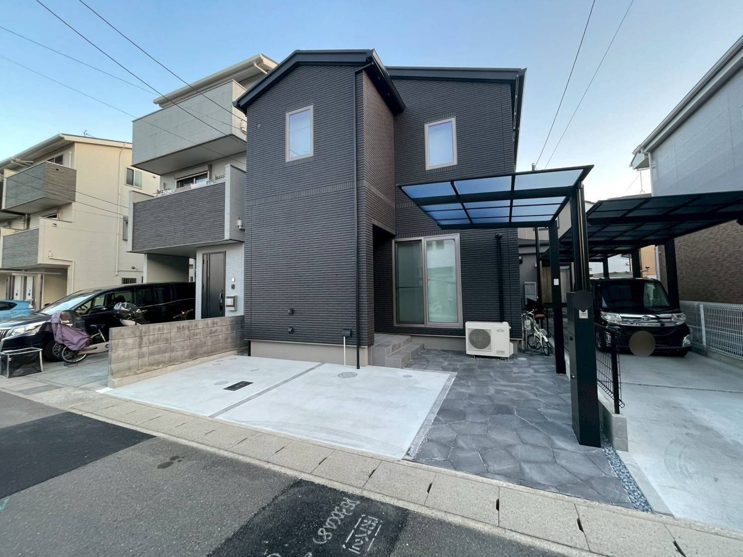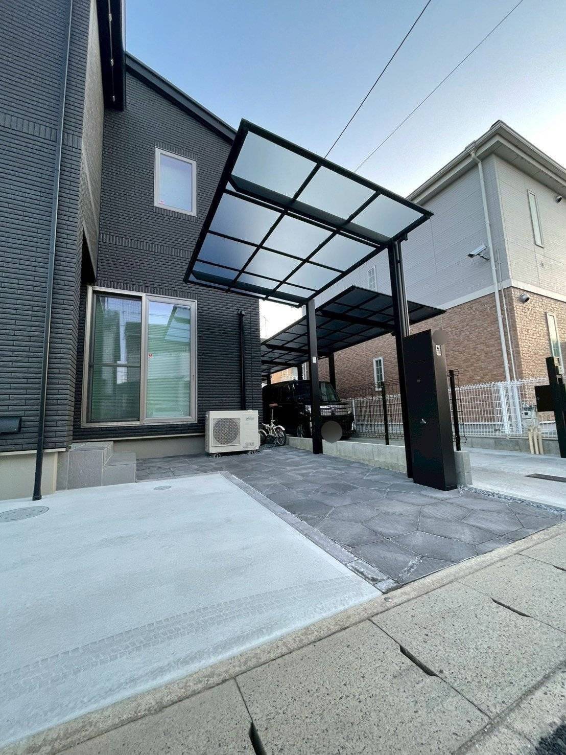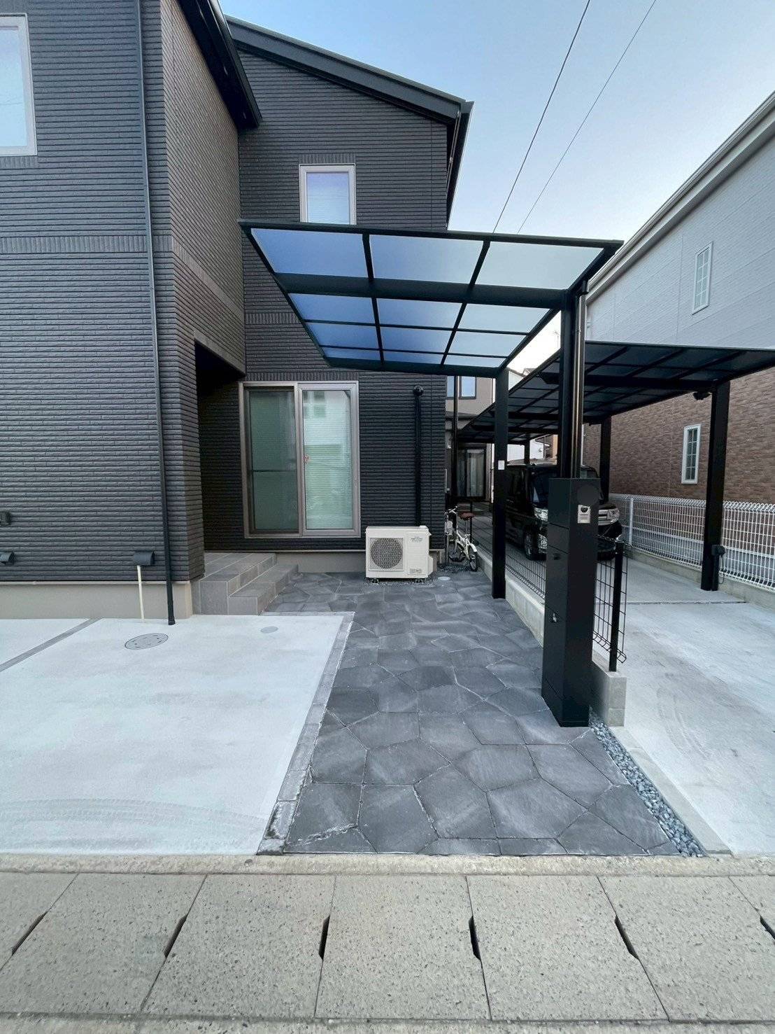 住宅全体のモノトーン配色に合わせたモダンで落ち着いたスタイリッシュガーデン〜。シンプルながらもデザイン性の高い幾何学模様が印象的な久保田セメントの石貼風『ペンタリーフ』をアプローチに配置。シックで落ち着いた色味のカーポートや機能門柱と相性がよく、全体的にスタイリッシュな仕上がりに~。