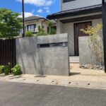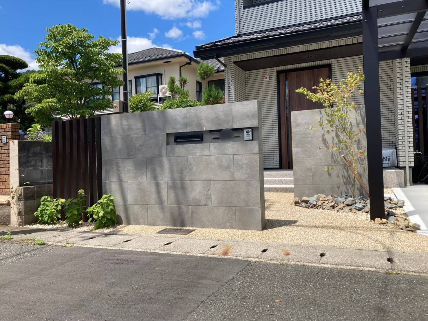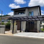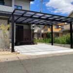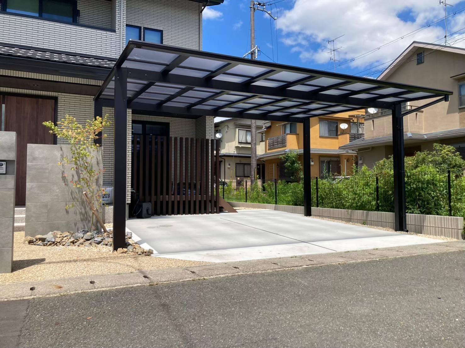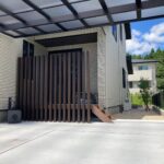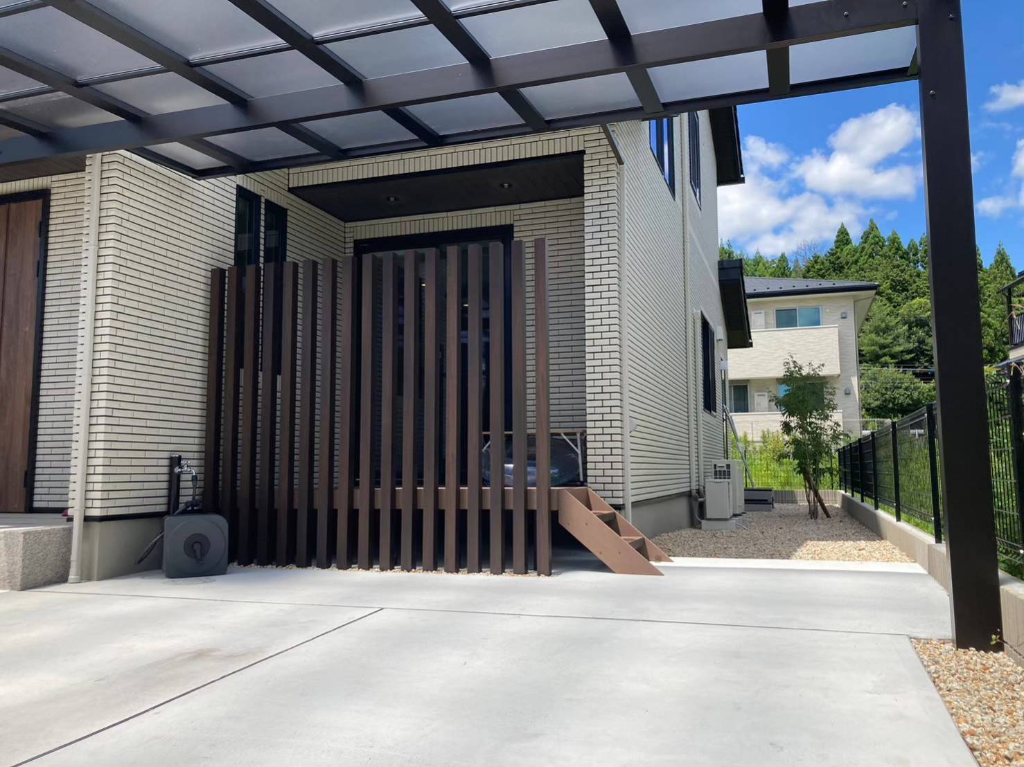 シンプルで広がりのある駐車場空間。玄関まで雨に濡れずに建物への出入りができ、ウッドデッキテラスの前に縦格子スクリーンを構えることで外部からの視線を遮り室内を明るいくつろぎ空間へ。