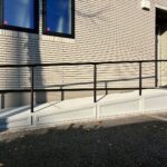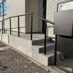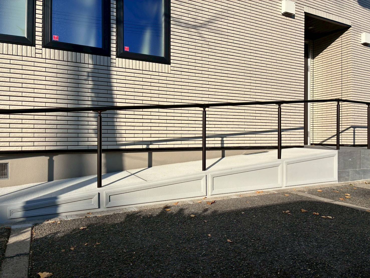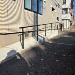 シックな階段と、緩やかなお洒落スロープを使用した2方向から玄関アプローチへアクセスできる、利便性も考えられたバリアフリーデザイン外構。シンプルになりがちなスロープ側面にモールディング加工することで、お庭全体の雰囲気を美しく飾ることができ、意匠性の高い高級感ある雰囲気を演出できます。
